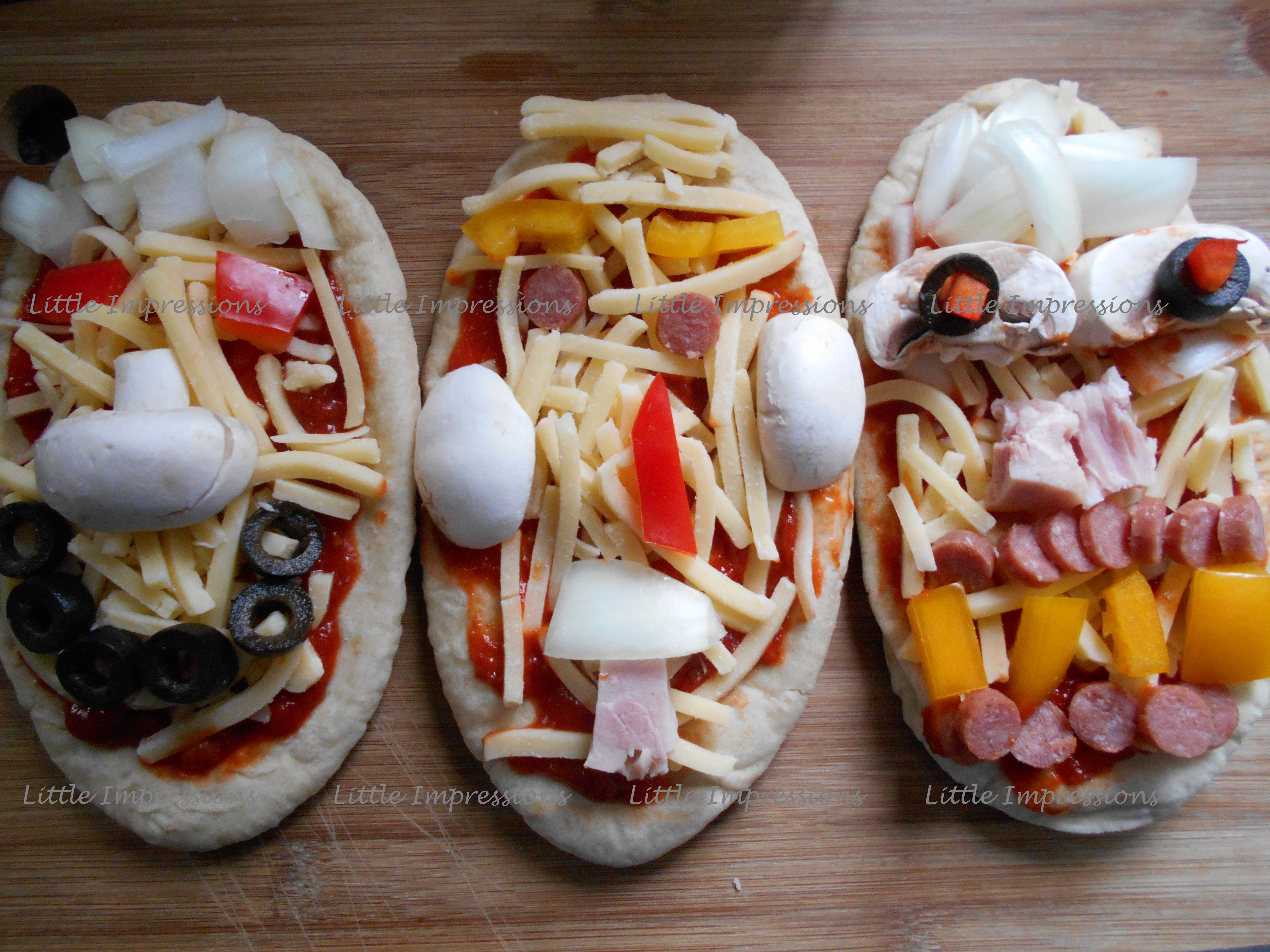 So now the fun part, we picked our toppings and placed them on the bases,letting my daughter be creative making faces on them as you can see below. And if your anything like us we ended up nibbling half the toppings before they made it to the pizza.